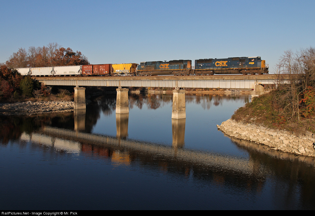 Late in the afternoon on a late fall day, a pair of EMD's lead Q583 across the Elk River bridge. The second engine, #4848, is an SD70ACe, a fairly rare bird for CSX. Q583 is a daily train from Nashville to Atlanta.