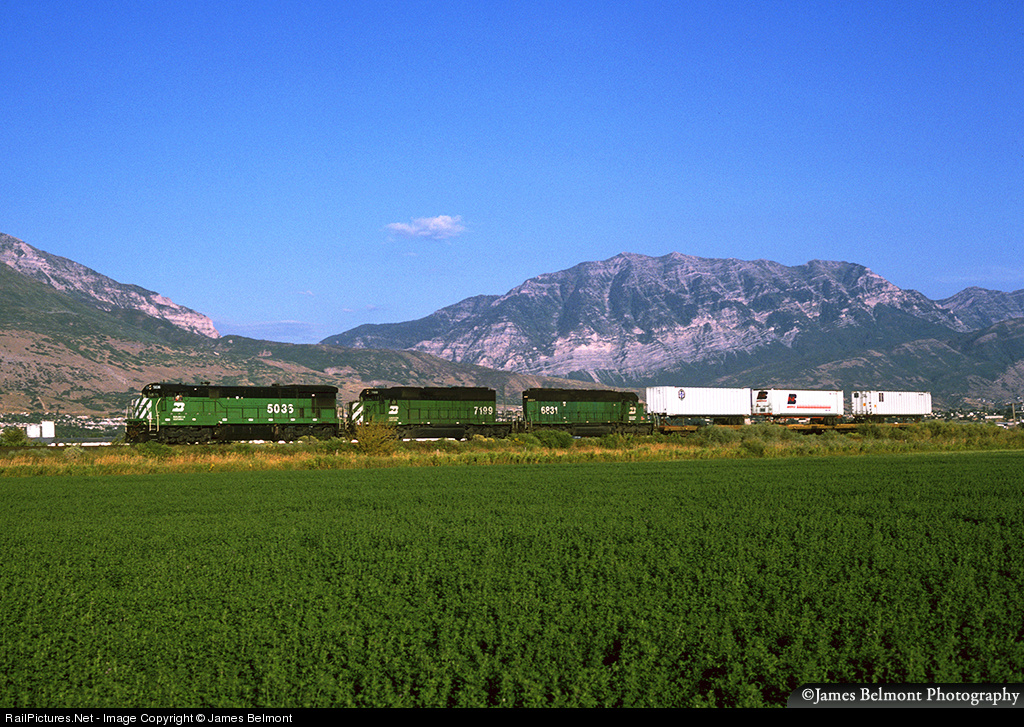 Part of the agreement with the US Surface Transportation Board to allow the UP and SP to merge was for a second carrier to provide competition between Denver, CO and Stockton, CA and the BNSF agreed to do just that. BNSF's efforts to compete in the intermodal market between Denver and Salt Lake City was short lived. Pictured near American Fork, a trio of piggyback trailers from Denver head west through Utah Valley, bound for the Roper piggyback terminal in South Salt Lake.