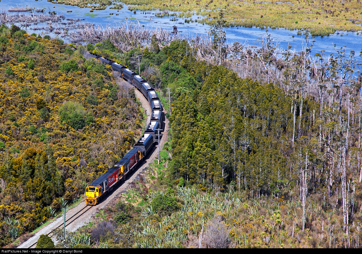 While the eastern rail approach to the Southern Alps is more rugged and dramatic, the West Coast (which has unfairly garnered a reputation as having a permanent pall of miserable weather) has a character and lush beauty all of its own. A hundred and fifty years ago, bushland punctuated by native forests covered 'the coast' before being harvested for logs and cleared for farmland. Empty coal train 849 skirts the edge of Lake Brunner as it approaches Moana through the classic west coast flora on the right side of the picture. On the left are yellow flowers of gorse, an ornamental plant kindly introduced to the country by European settlers in the mid 1800s along with rats, stoats and other wildly successful imports. Gorse spread like crazy, but in many areas, including here, its slowly being naturally crowded out by the regrowth of natives.
