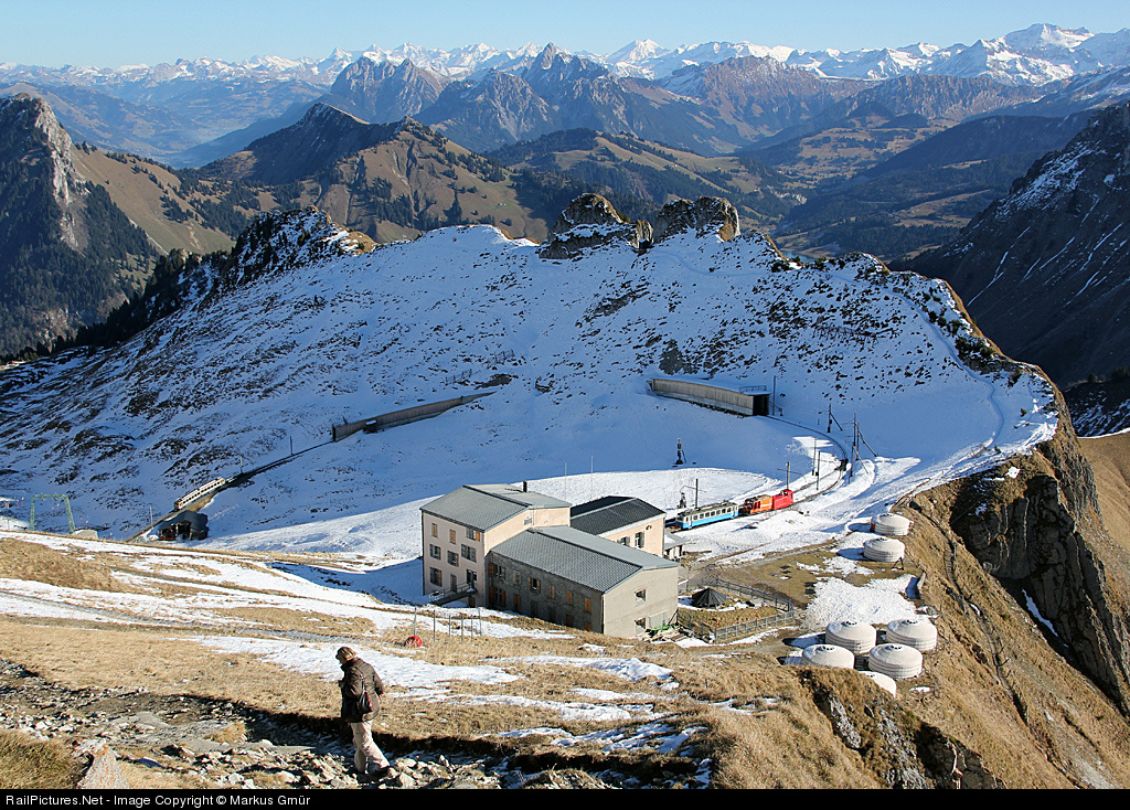 View from the peak Rochers de Naye (2045 meters over sealevel) to the station Rochers de Naye (1970 meters over sealevel) and the first part of the track downhill. Left the railcar from Montreux to Rochers de Naye. In the station the blue-white railcar #207 and the small red loc #4. In the background the Swiss Mountains with and without snow