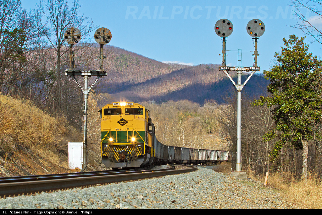 | After successfully traversing the grueling Blue Ridge grade spanning from Bedford to this location situated in Blue Ridge itself, NS S11 parades west toward Roanoke with Norfolk Southern's Reading Heritage locomotive doing the honors. |