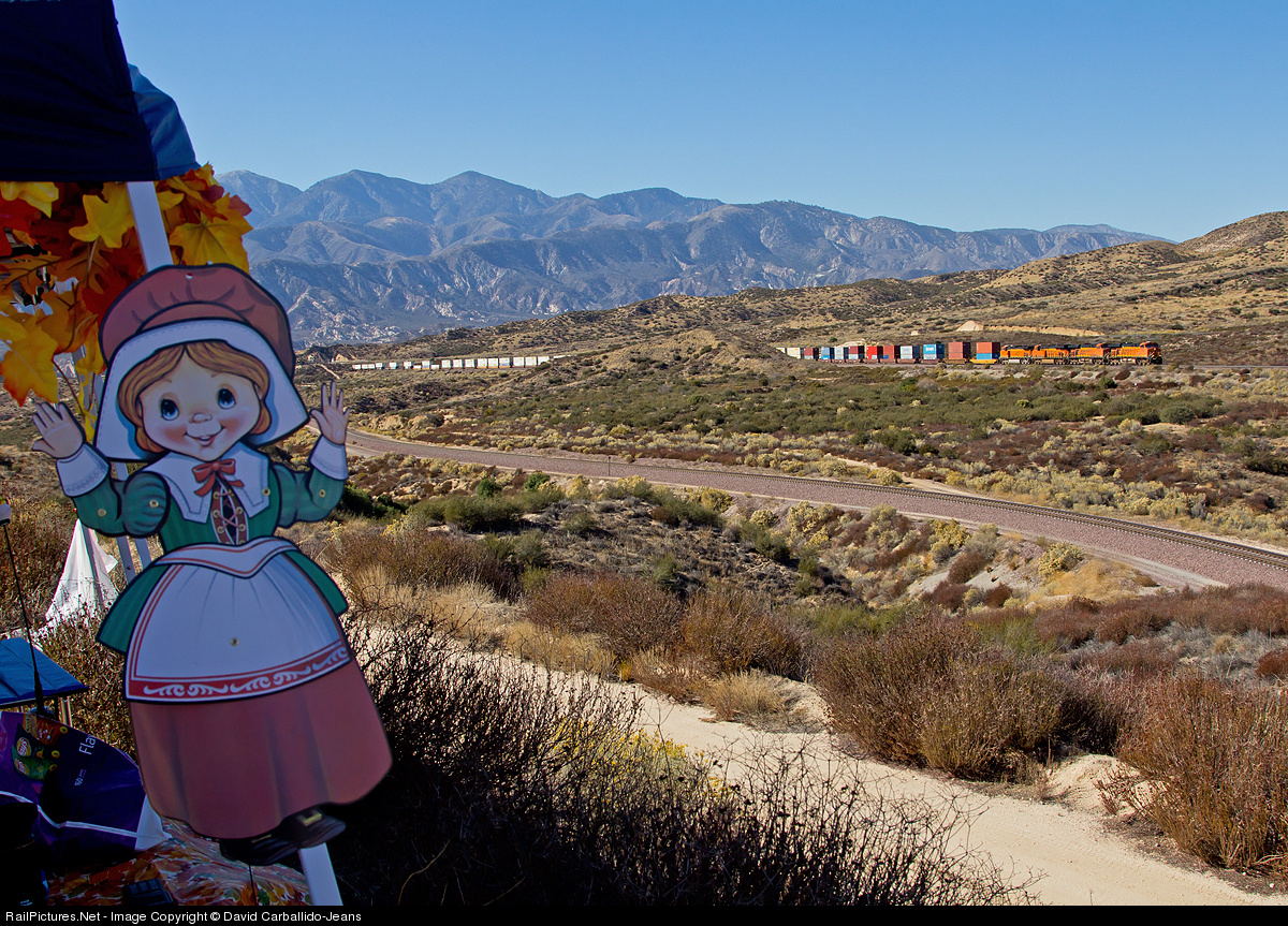 Cajon's "Fall colors" are showing again! Now on Thanksgiving weekend, four BNSF GE's charge hard up the two percent grade of Silverwood along Cajon Pass as they pull this Los Angeles, CA to New York, NY high priority intermodal train.