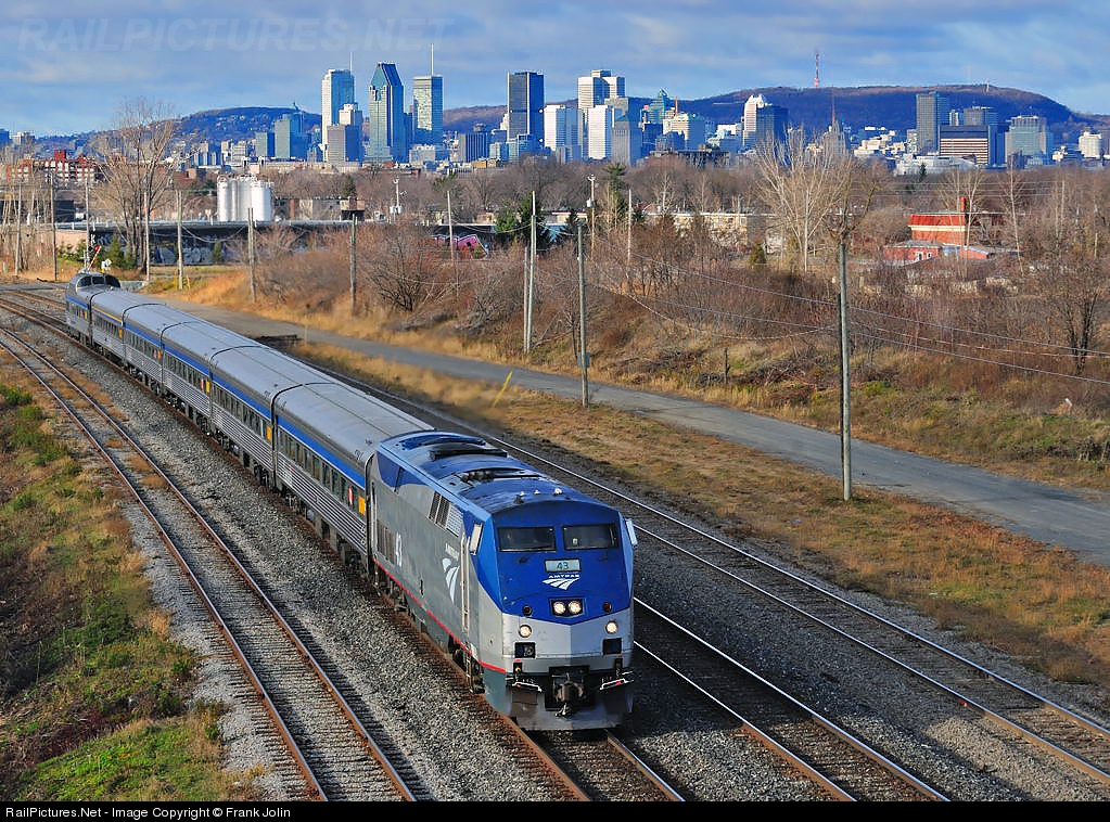 | On a cold November morning, Amtrak Adirondack with leased VIA Rail stainless steel equipment, has just left the Island of Montreal as it rolls on the south shore at St-Lambert |