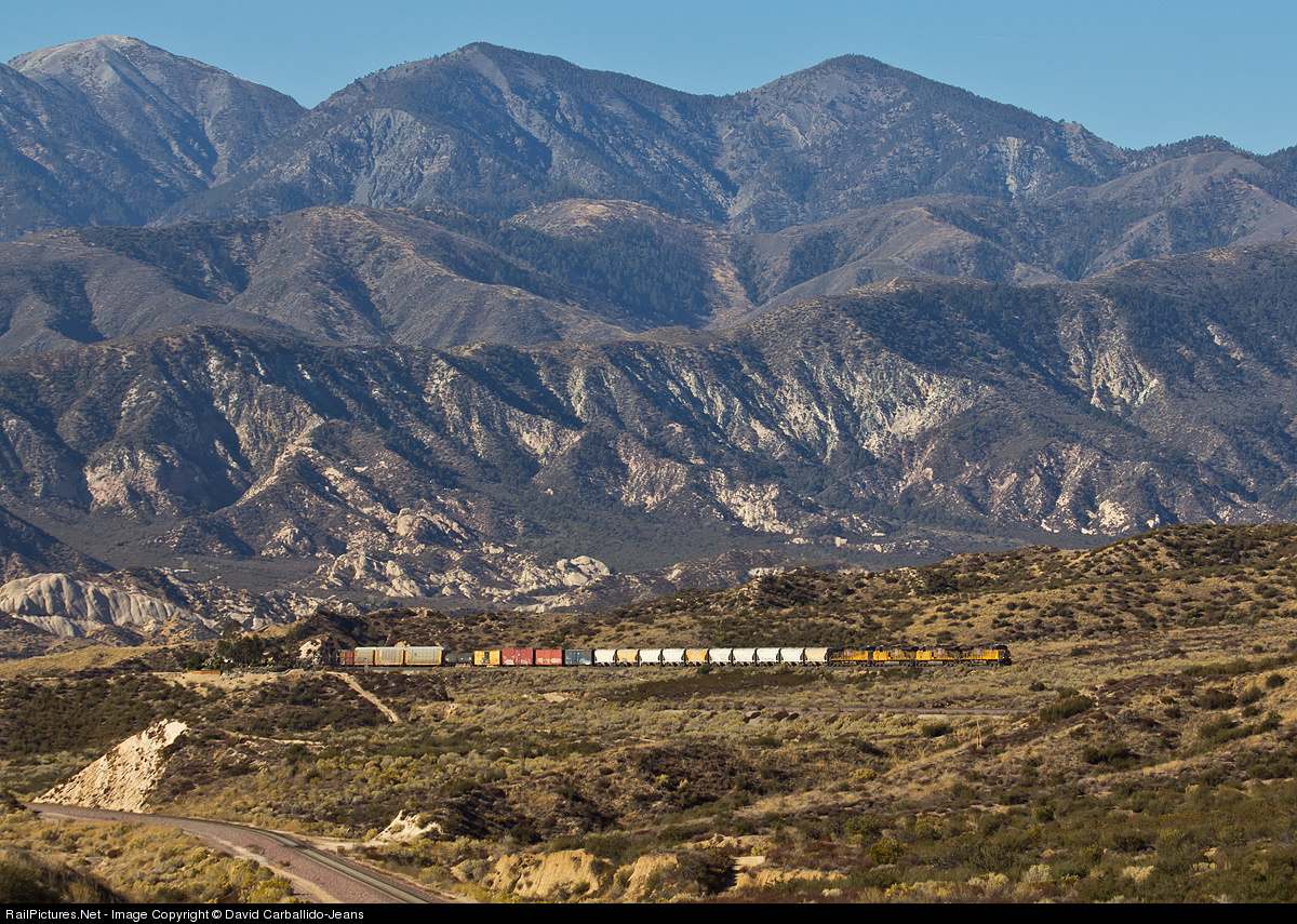| A UP manifest bound for Roseville, CA grinds up the UP Palmdale Cutoff as the snow-less mountains make this November shot seem like a mid July photo. |