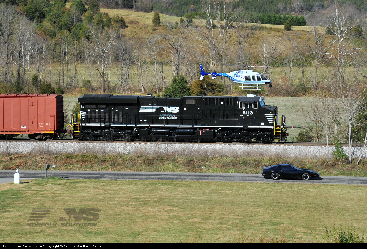 Norfolk Southern recently teamed up with General Electric to film a commercial advertising GE's "Brilliant Machines". The commercial features NS GE ES44AC #8113 pacing alongside the Knight Rider car, "KITT", and was filmed from various vantage points, including aerial helicopter footage. Here we see the first take of the "pacing" scene being filmed along Lithia Road between Lithia and Buchanan, VA. Photo by Casey Thomason. For more information, visit www.nscorp.com