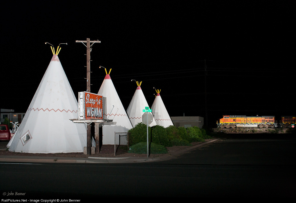 Sleep in a WIGWAM: BNSF 5020 leads the Z-LACKCK1-11A eastbound past the Wigwam Motel on old US Route 66 in Holbrook, AZ at 2248 on October 11, 2007.
