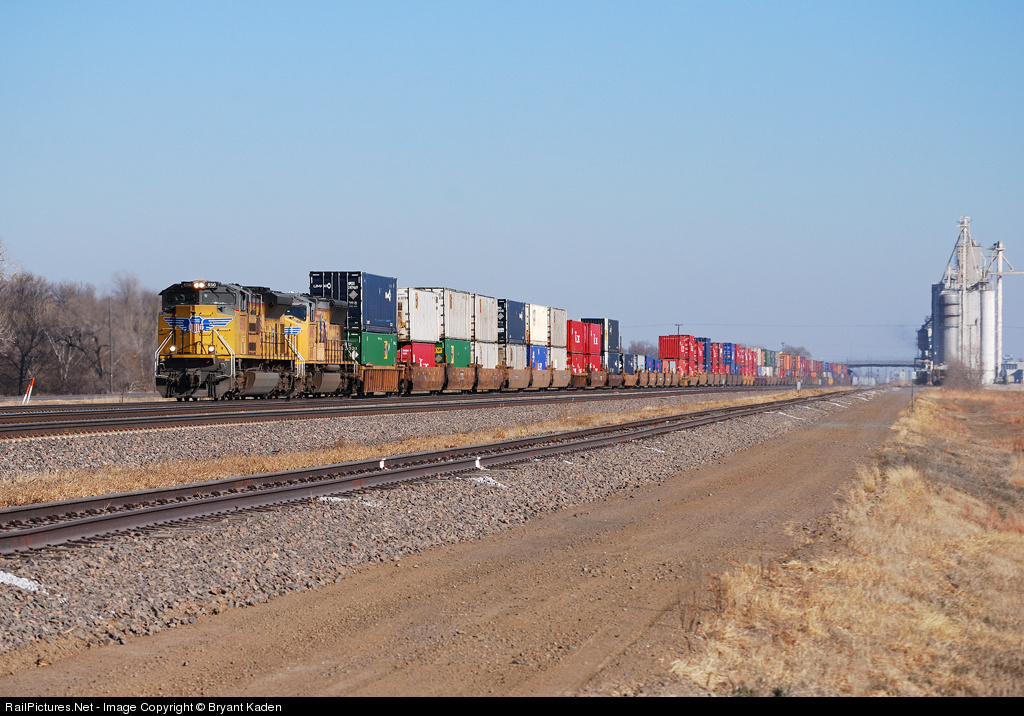 A westbound Union Pacific stack train is in the first few miles of the busiest freight railroad in the world as it leaves the town of Gibbon behind and heads for Kearney.