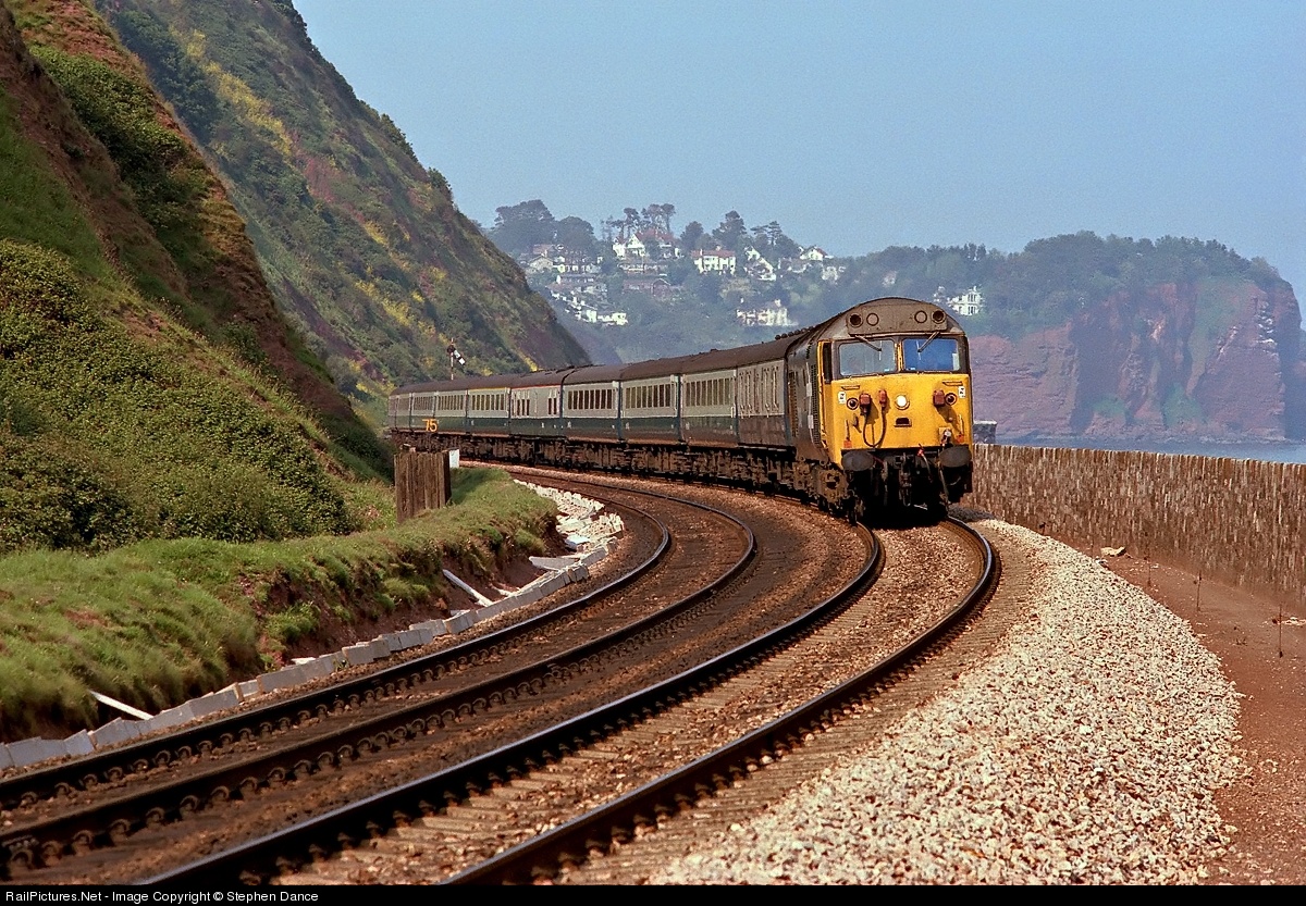 | Having emerged from Parsons Tunnel under the headland in the background, 50 042 "Triumph" prepares to leave the Sea Wall behind as it approaches Teignmouth with 1V85, the 11:33 Manchester - Newquay |