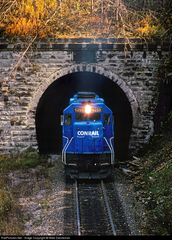 A westbound Conrail freight emerges from the old Allegheny Tunnel at Gallitzin, Pennsylvania, on October 23, 1988. In 2005, this tunnel was enlarged to clear double stacks and double-tracked, and the adjoining Gallitzin Tunnel was abandoned, changing the track arrangement in the area.
