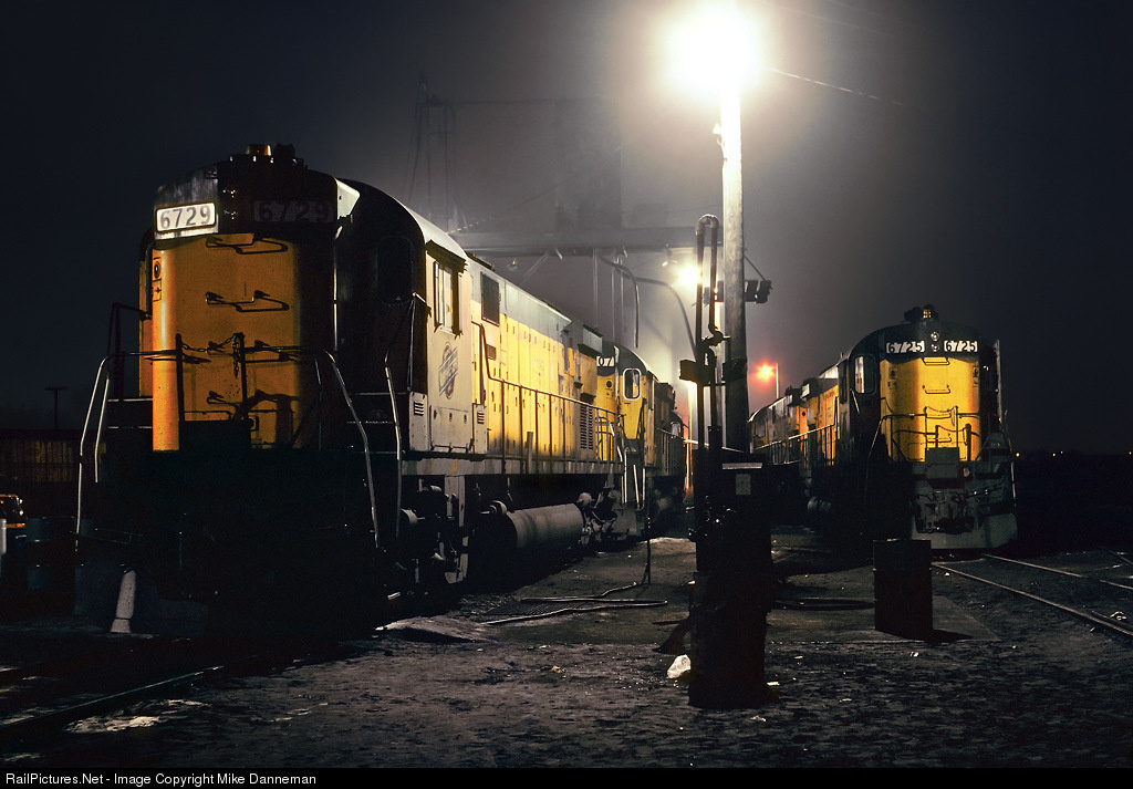 Foggy night in Escanaba Sets of Chicago and North Western Alco C-628s slumber the night away at the roundhouse at Escanaba, Michigan, in October 1984. The weather was dismal on this visit to C&NW’s Alco-powered ore line, and I thought I’d salvage the day’s photography by grabbing a couple of night shots at the roundhouse. To my disappointment, my home-made flashgun that fired 5B flashbulbs had broken a wire or two, so I thought my night photos might not work out so well either. I ended up shooting a few images with only available light, and this is one of them. Oh well . . . at least the roundhouse tracks were teaming with Alcos!
