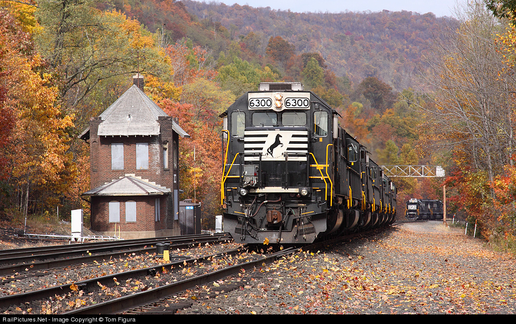 | An eastbound group of NS helpers meets a group of westbound helpers at MG Tower. The fallen leaves are kicked up from between the rails as the trailing 6300 heads down the mountain toward Altoona,PA.