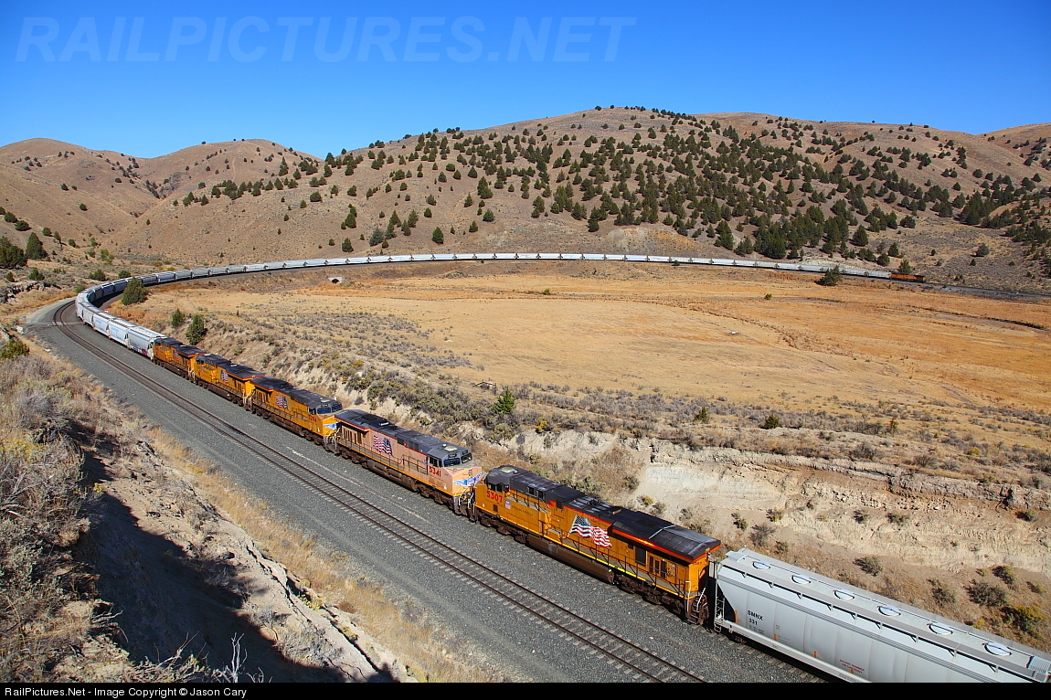 UP5941 is the leader of a Soda Ash train bound for loading on Ocean Ships on the Columbia River. UP5307 is the first of 5 mid-train DPU's and a 6th DPU shoves hard on the rear. DPU's ended most manned helper operations over the 2.2% Hindman Hill. This is Mountain Railroading!!!!!