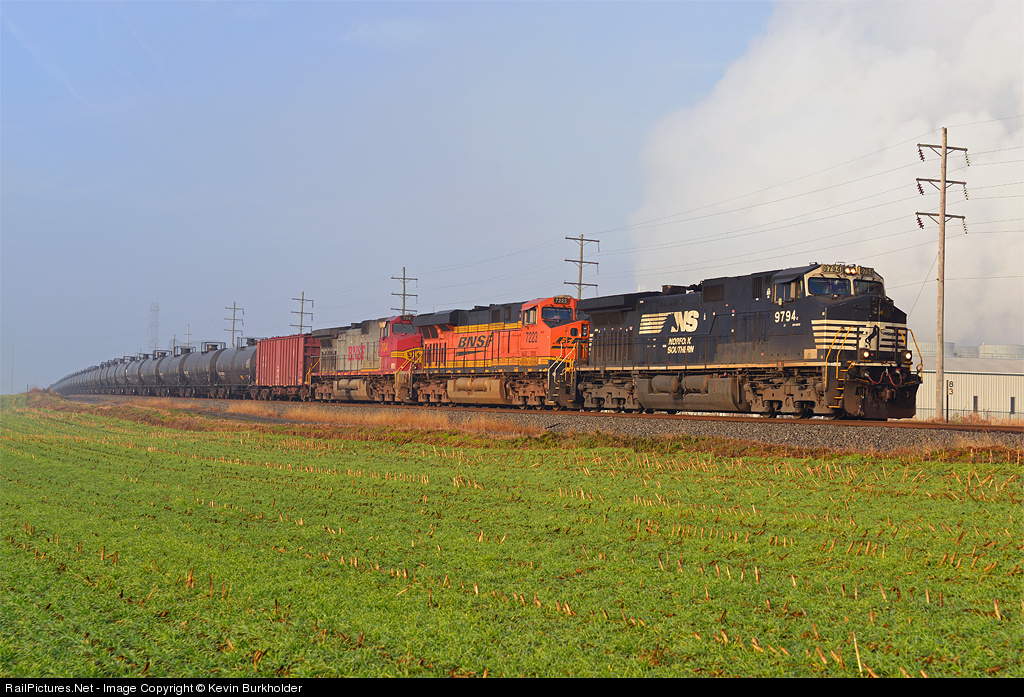 Norfolk Southern loaded Bakken crude oil train 64D originated on the BNSF and is seen eastbound at Prescott, Pennsylvania, behind NS C40-9W 9497, BNSF ES44AC 7223, and BNSF C44-9W 704 (in warbonnet paint). The landscape (and temperature) are more like April than December 4 as light fog lifts.