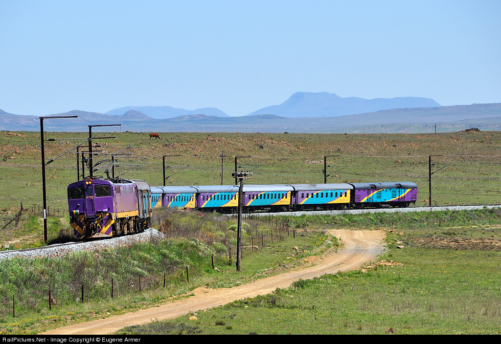 A lonely cow on the hillside seems oblivious to the passing of the Johannesburg - East London "Amatola", as it winds its way out of the Molteno valley with the Bamboesberg visible in the distance. This section is usually covered early in the morning, well before sunrise, but today's train is running six hours late. The power car at the rear of the train is painted in the newer version of the Shoshololoza Meyl livery.