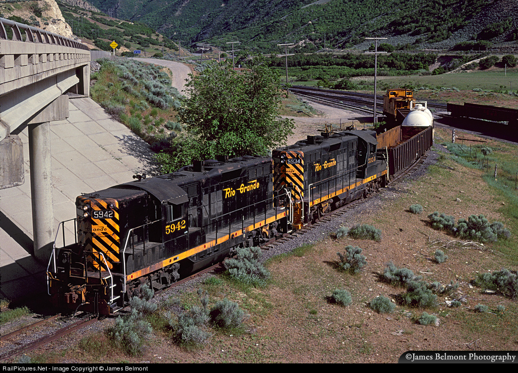 Rio Grande local #666 exits the westward main track while ducking under US Highway 6 with a tank car of nitric acid for Trojan Explosives in Spanish Fork, Utah. D&RGW's Gomex spur was constructed for the original tenant, Gold Medal Explosives. The spur was abandoned some time ago, although the overpass is still in place above the grade.