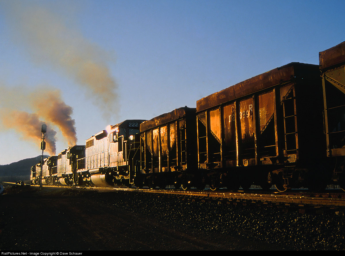 Four Missabe units begin the assult on Steelton Hill at sunset with a train of empty ore cars. This train was a joint ore move between WC (note the ex-C&NW ore cars) and the DM&IR from the Minorca Mine in Minnesota to the port of Escanaba in Michigan.