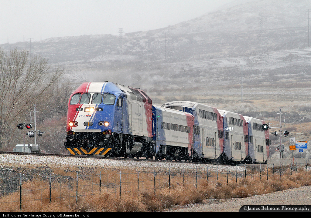To kick off the opening of Utah Transit Authority's new Salt Lake City to Provo extension of commuter rail, the agency offered free rides to the public on Saturday, December 8, 2012. The trains ran 30 minutes apart between Salt Lake Central and Provo Station. To help the hungry, UTA requested donations of canned 'food for fare' to board the train. Here the UTA 19 glides north through Bluffdale with a standing room only crowd of passengers.