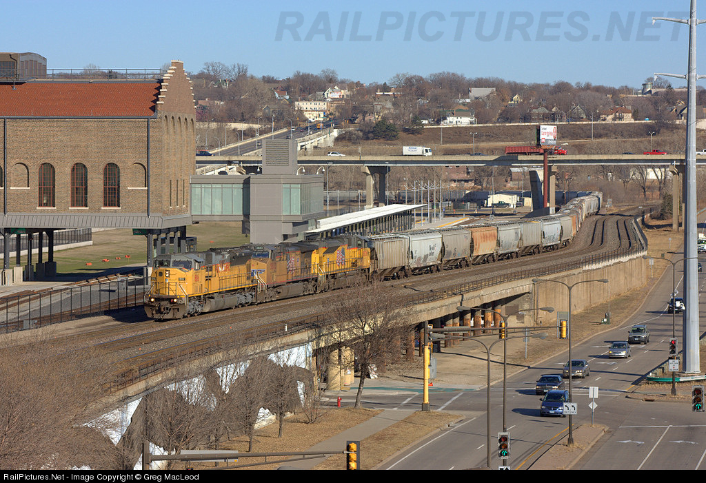 | A UP grain train crawls past Saint Paul Union Depot. The depot last saw passenger train service in 1971, but will soon see new life. The new platform and loading tracks are installed, but not yet tied to the mainline. The station re-opened for bus service on Saturday Dec 8, but Amtrak and light rail will not start service until sometime in 2013. |