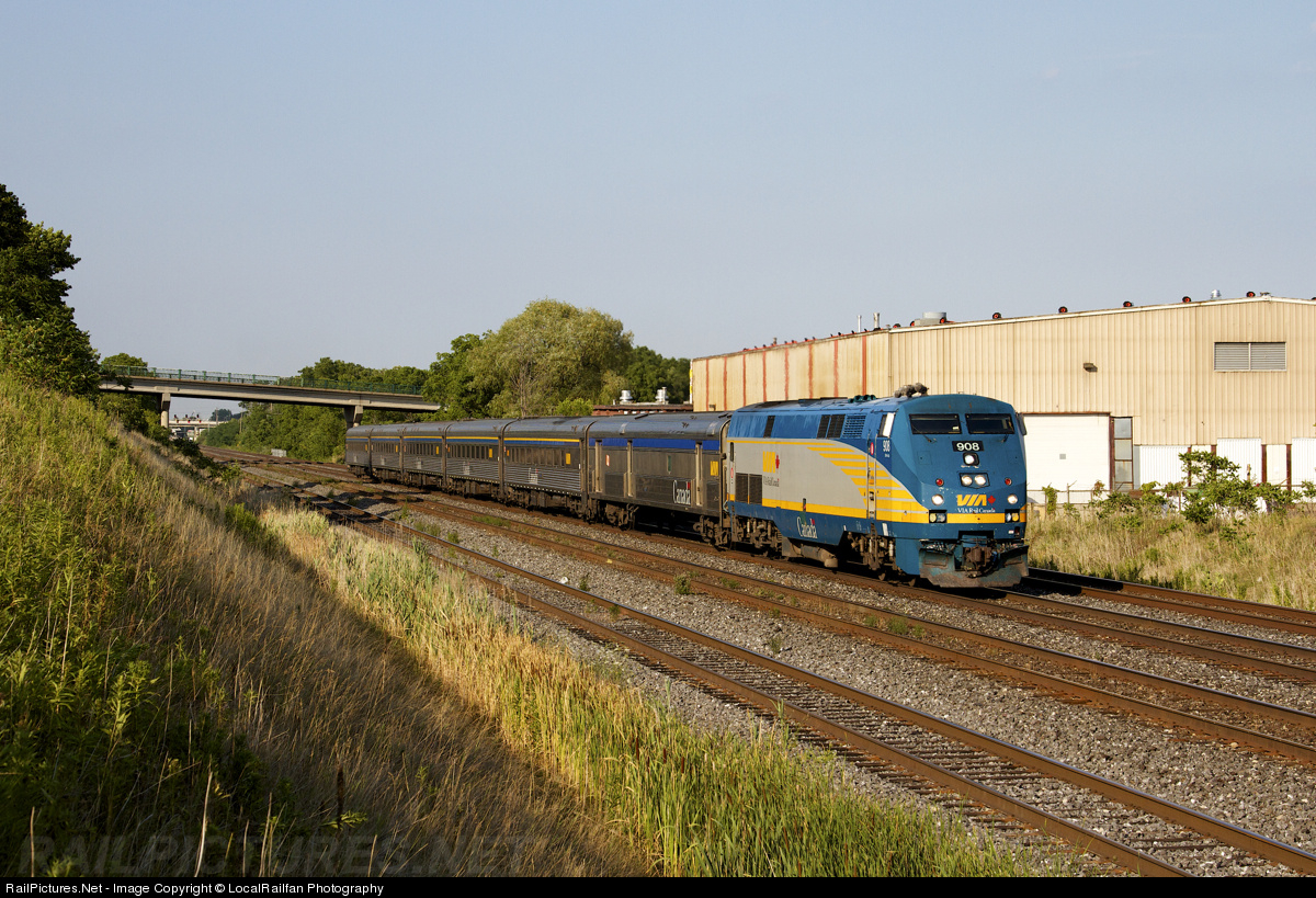 | After completing the required station stop at Aldershot, VIA 908 is in charge of train 75 with 6 cars for the next stop at Brantford further west on the Dundas Subdivision. |