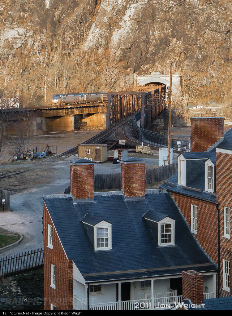 | Catching the last rays of sun before it ducks behind the hills surrounding Harpers Ferry. The Capitol Limited blasts out of the tunnel and slows for its regular station stop. Notice the high waters of the Potomac River after the previous weeks heavy rains. Taken with permission by the National Park Service. |