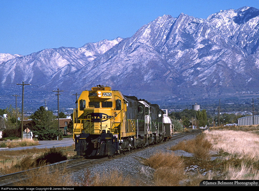 An interesting lashup of Santa Fe, Burlington Northern, and MidSouth geeps lead Utah Railway's RUT311 local up UP's Bingham Industrial Lead in West Jordan. Snowy 9,026 ft. Mt. Olympus marks the east side of the Salt Lake Valley. This setting has changed in a big way as it is now Utah Transit Authority's double track, catenary equipped TRAX Red Line to Daybreak.