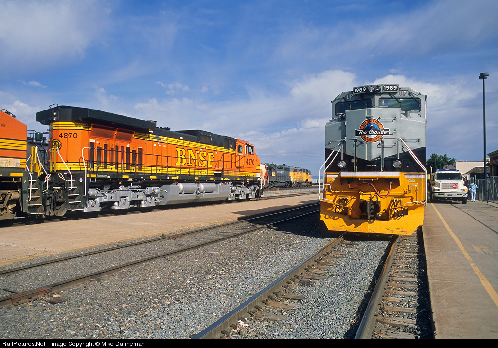 Action at Grand Junction Union Pacific’s Rio Grande Heritage locomotive No. 1989 is on the point of a Operation Lifesaver passenger special at Grand Junction, Colorado, and is getting fueled up for another day’s trips on the morning of June 15, 2009. On the left is a westbound BNSF freight with a nice, clean GE Dash 9 on the point, waiting for a new crew. And in the middle of it all and also heading west is UP’s Landmark Local powered by two EMD GP40-2s.