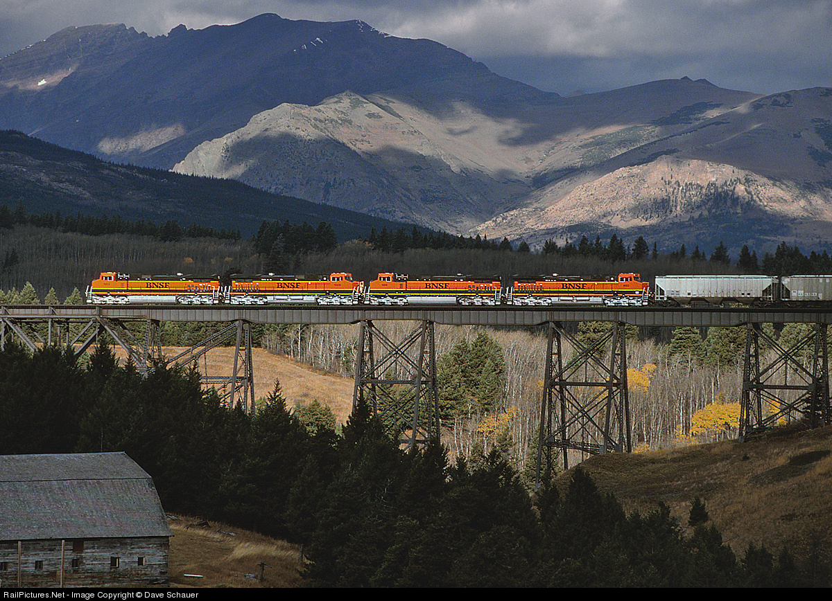 Four new GEs rumble across the most photographed railroad bridge (and barn) in Montana as this westbound loaded grain train heads up the east slope of Marias Pass.