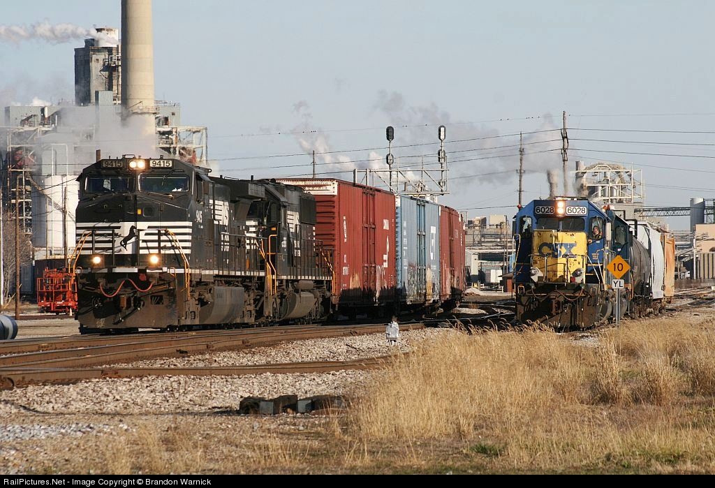 Norfolk Southern #9415 eases past the CSX local which is awating permission into the NS yard at Decatur Illinois.