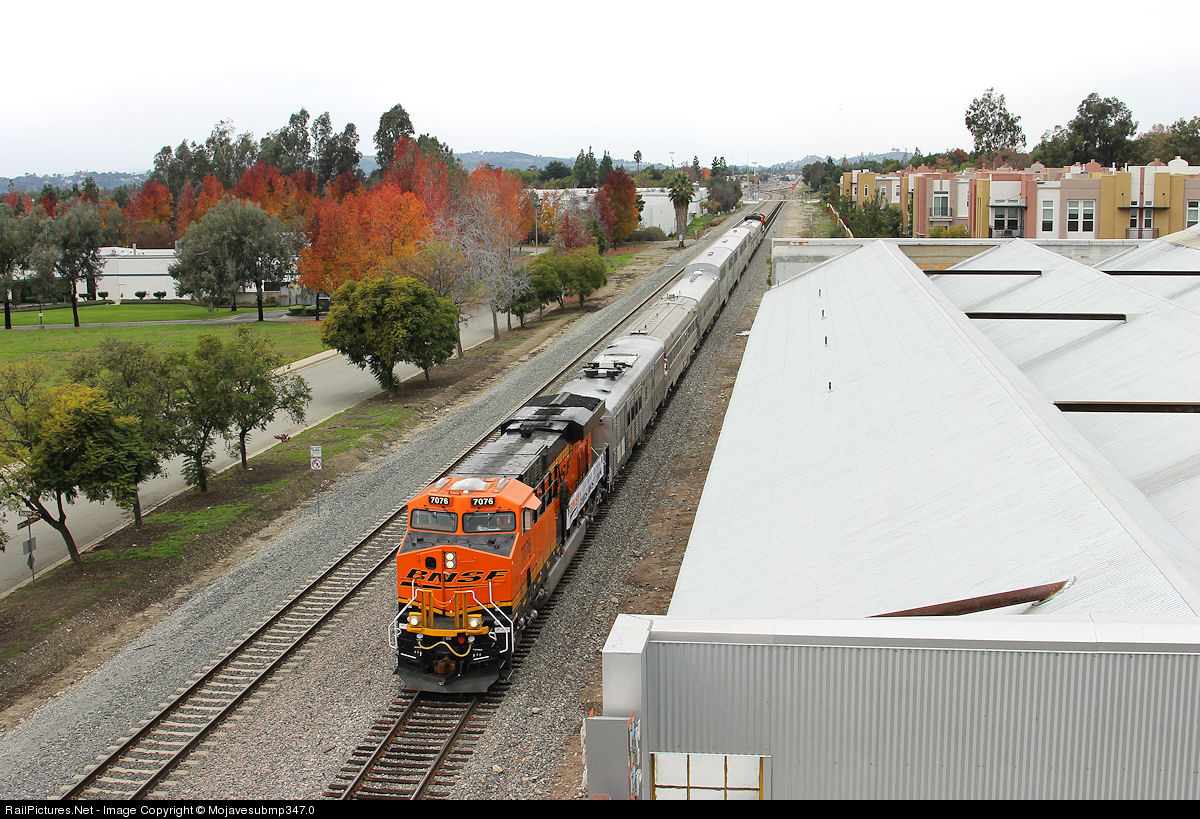 | After running to Glendora on Santa Fe's old Second District main and changing ends, BNSF 7076 leads the eastbound return trip through Claremont, CP Cambridge can be seen in the background. |