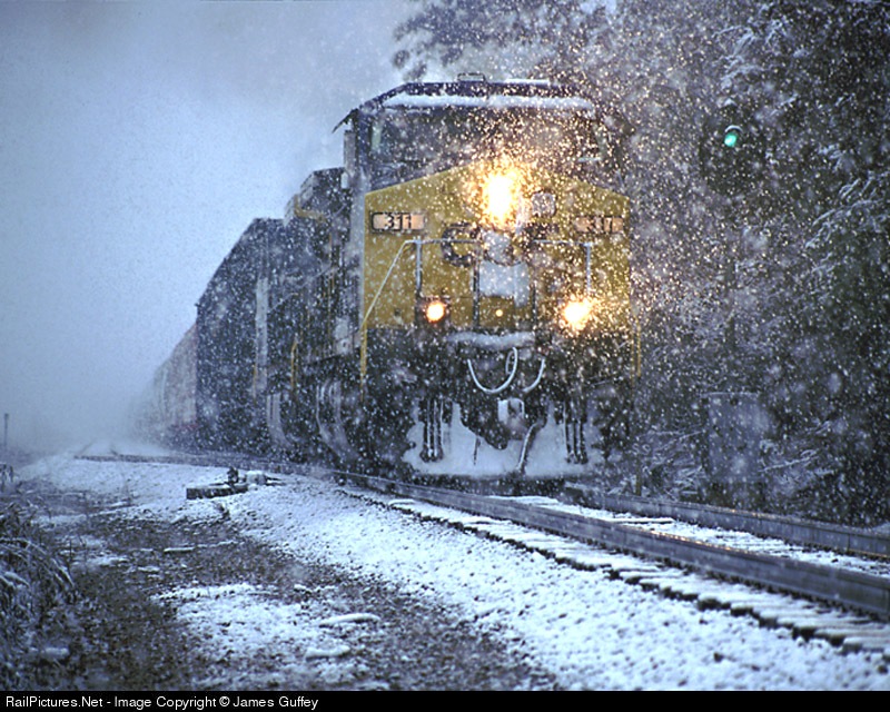 | An unexpected heavy snow shower envelops Q696 as it comes out of a meet at the north end of the Duke siding, 12 miles NW of Charlotte. The green signal is a spring switch indicator that simply confirms switch alignment. Thus, the odd "clear" signal. |