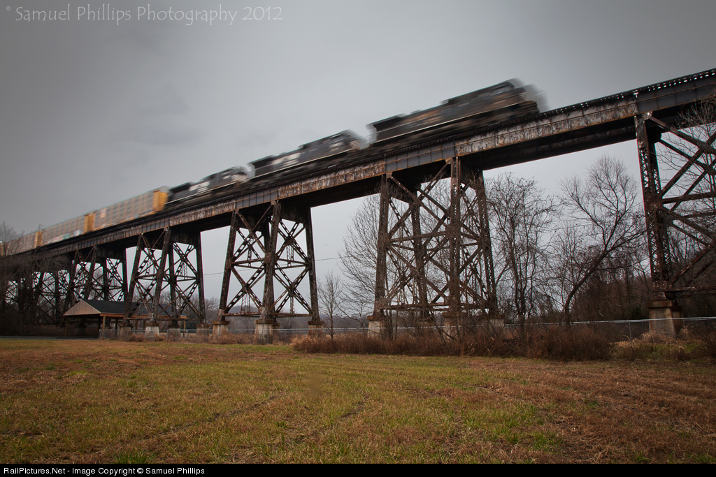 | Hotshot intermodal #214 charges over the Staunton River in Altavista, VA as it files north through the quaint community with a trio of Norfolk Southern motors heading up the train. After arriving in Lynchburg, NS 214 will perform a speedy set off for Norfolk bound intermodal I3G to attach to his train for the trek east. Rain clouds begin moving into the area that will bring heavy rain to Central Virginia overnight. |
