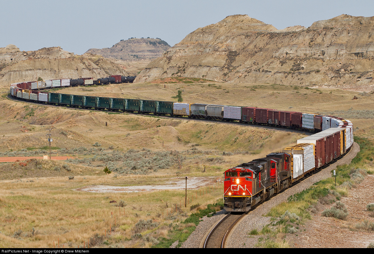 | 3 CN units lead a BNSF eastbound manifest through the North Dakota Badlands at Sully Springs,ND on 7/31/12. This is the second time I have caught a BNSF train led by another railroads pool power at this location. |