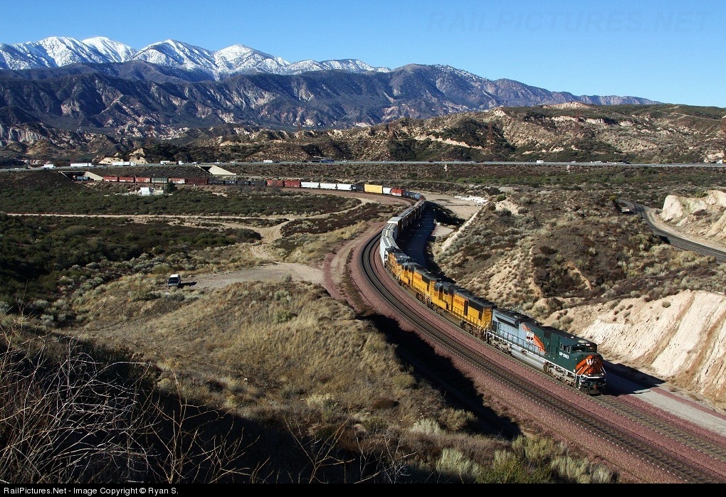 | Wes Pac vs. the Cajon grade..... UP 1983 adorned in heritage colors of the Western Pacific railroad is the lead motor on UP's eastbound MWCNP-15 (West Colton, CA to North Platte, NE; manifest). The MWCNP is conforming to the curves on main track 1 that swings trains through the old station of Alray as they gain elevation on Cajon's western slope. UP 1983 will soon enter a large cut were tunnel 1 once stood, tunnel 1 and tunnel 2 were daylighted during a triple tracking project leaving only a large cut in the earth where they once stood. A fresh dusting of powder tops off the San Gabriel mountains off in the distance. |