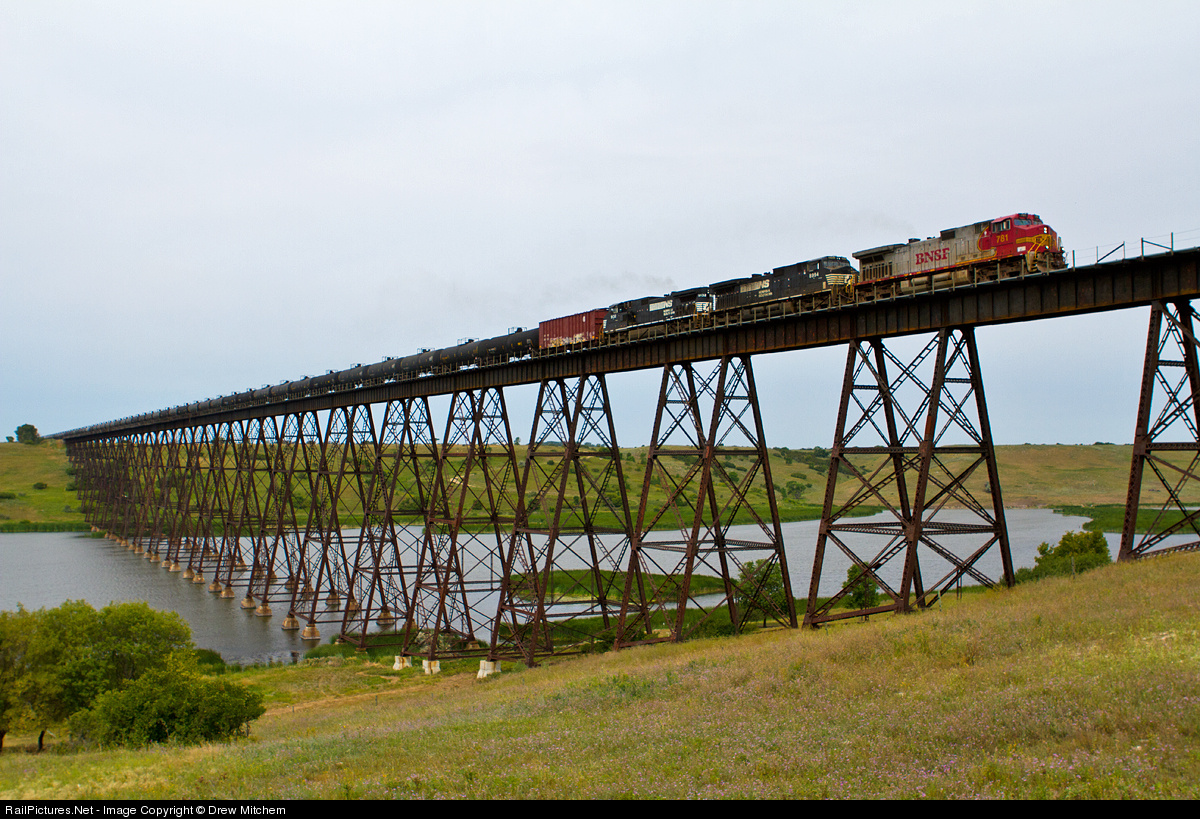 A eastbound BNSF oil load passes over the big trestle at Luverne,ND on a cloudy summer day. Photo taken on 8/1/12.
