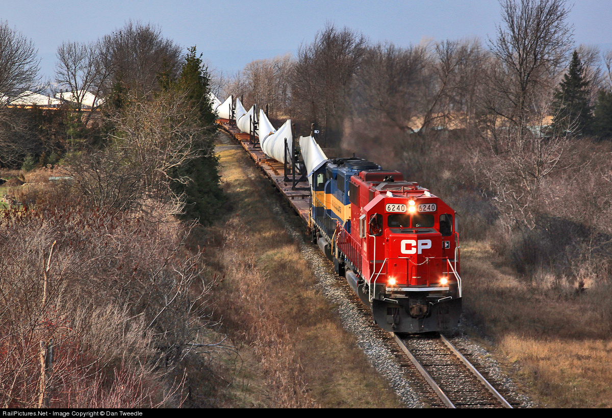 | CP 6240 and ICE 6415 lead DIM-004 over the top of the Niagara Escarpment with 60 flat cars and 30 wind turbine blades trailing. This is the fourth unit dimensional turbine move that terminates in Welland. The turbines are to be erected in the Caistor-Wainfleet area. |