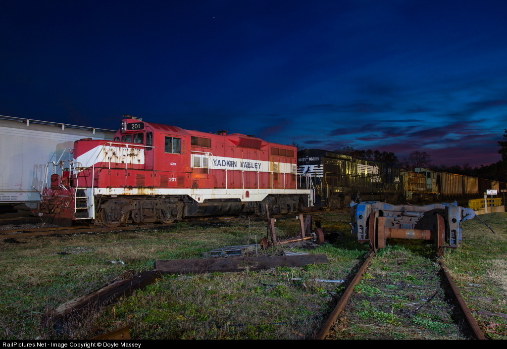 | Sequatchie Valley Railroads mixed bag of power sits in the small yard at Bridgeport including former Yadkin Valley GP7 201, former Pine Belt Southern Railroad B23-7 3986 which still wears Norfolk Southern paint and former Illinois Terminal SW1200 1210. |