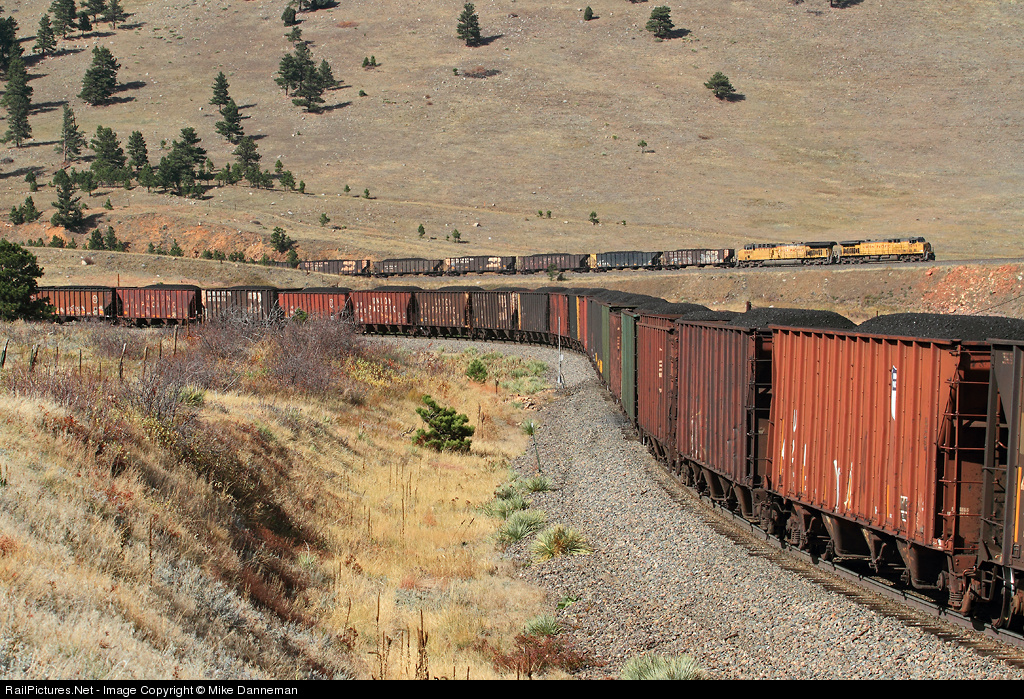 An eastbound Union Pacific coal load descends through the horseshoe curve encircling the mouth of Coal Creek Canyon at mile 22.6 west of Clay, Colorado, on October 22, 2012. In this view, two GE AC4400CW DPUs (Nos. 7099 and 6961) on the rear use dynamic braking to assist the train down the steep 2% grade. Moments earlier, the three lead locomotives passed this location (AC4400CW-CTE No. 5800 and two trailing AC4400CWs, Nos. 7182 and 7048), and there were no middle DPUs on this particular train.