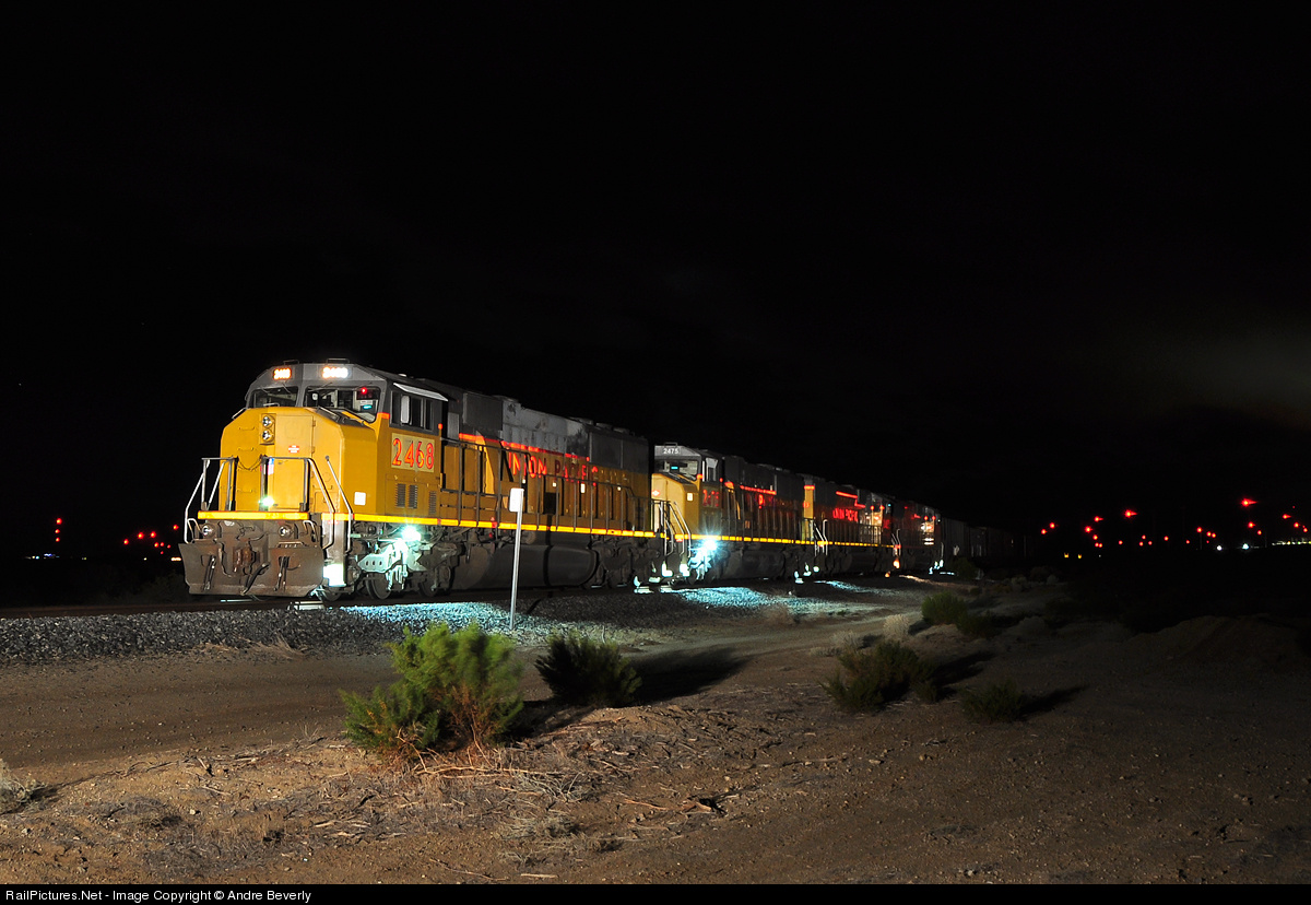 Head end of a long coal train parked outside Mojave, CA. Red lights lending a Christmas aura to the scene are from the wind turbines that surround the area. There are hundreds, and the lights all flash on and off simultaneously. It is rather eerie, actually.