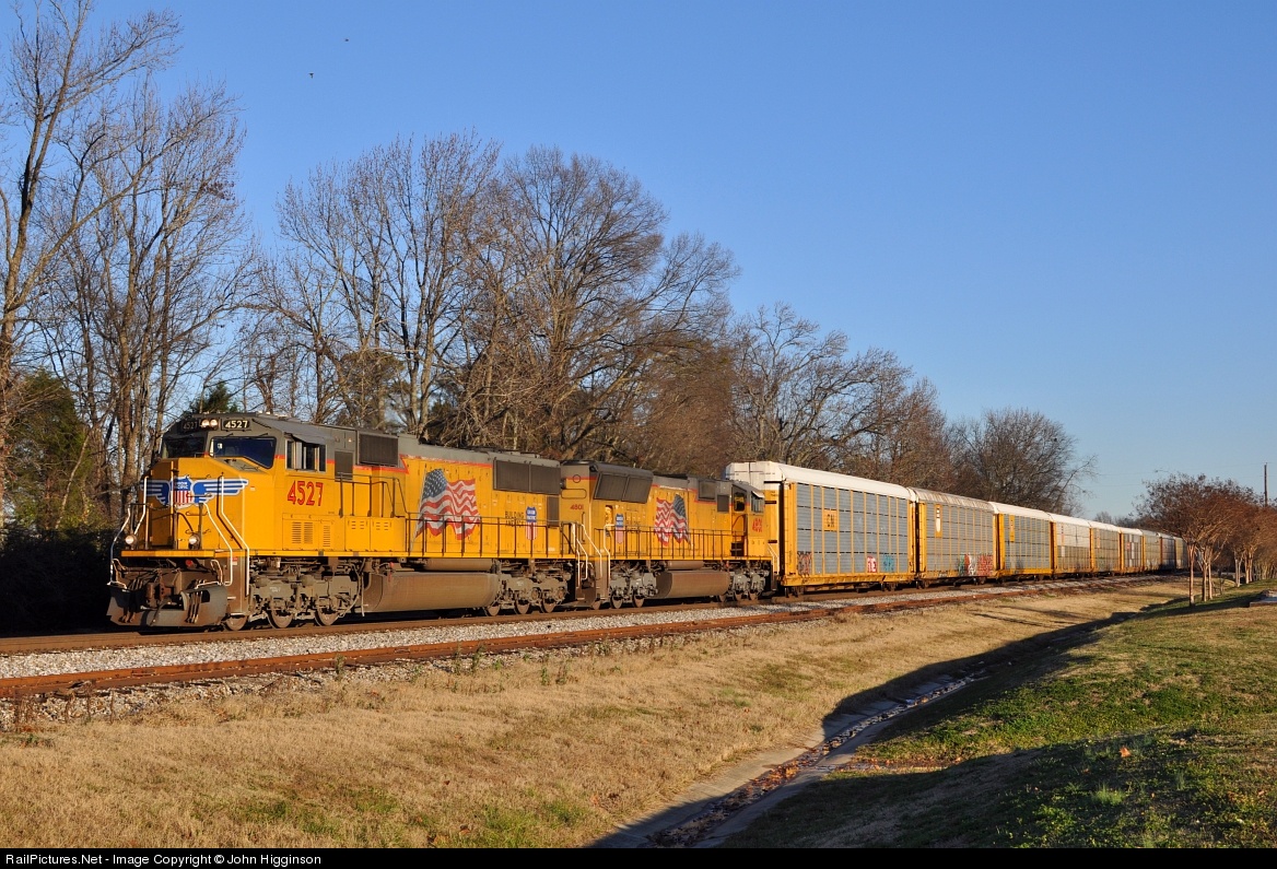 | Two flagged UP SD70Ms, the lead one being one of the first three UP units (4526-4528) to wear the American flag and "Building America" slogan, lead NS train W25 westbound. |
