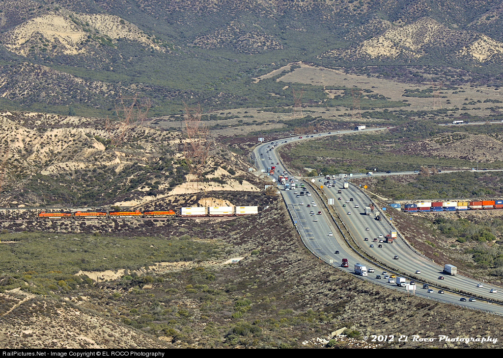 Alray California [Mayan Apocalypse Study 2012] - A westbound BNSF stack trains passes under Interstate 15 at Alray California as it approaches the westbound control signal at CP Walker in the Cajon Pass. This image was captured with a 400 mm lens mounted on a 1.4 x extender from across the canyon at a point above the UP Canyon Siding.