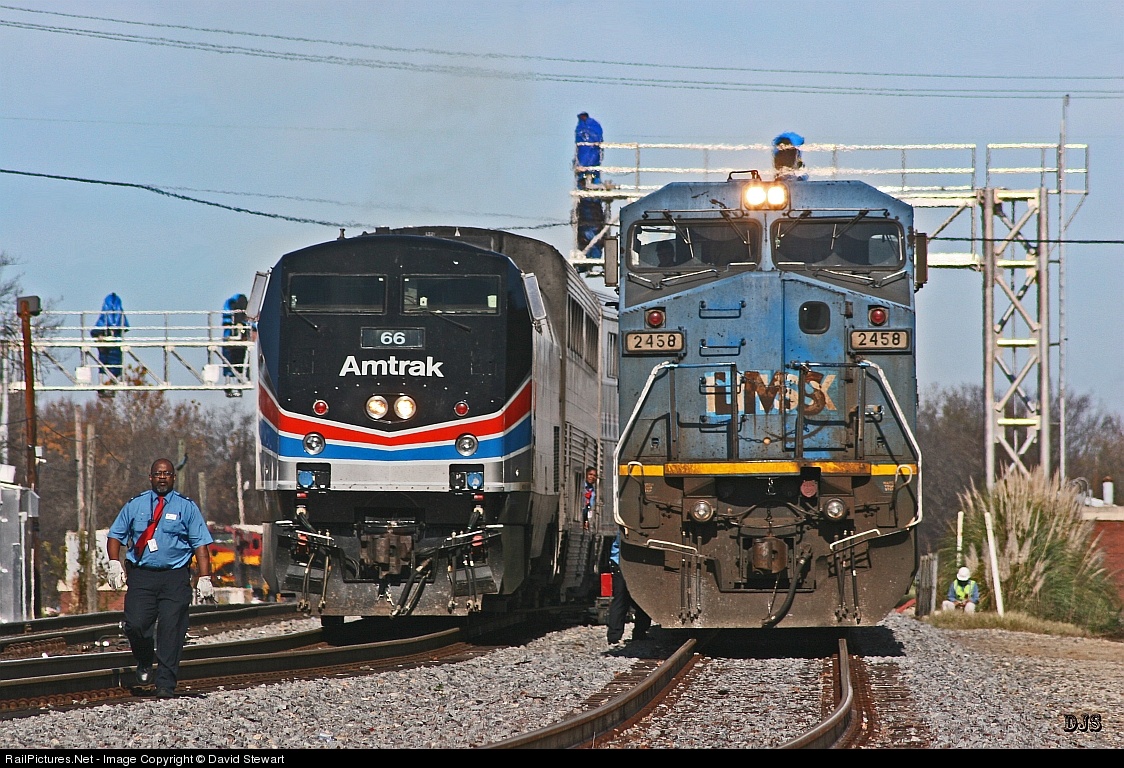| Amtrak's City of New Orleans eases into Switch Tender Jct in Jackson, Miss. after departing the station just out of sight. The eastbound KCS train in the distance will wait a little while longer as the engine crew on board AMTK train 59 and a CN Road Foreman of Engines places a worn out ex LMS CW40-8 in the lead due to loading issues with P42 66. Switch Tender will soon lose it's reputation as being an all manual junction between the IC/CN and KCS. New signals are seen in this view along with the Switch Tender himself who wasn't too thrilled about the idea. |