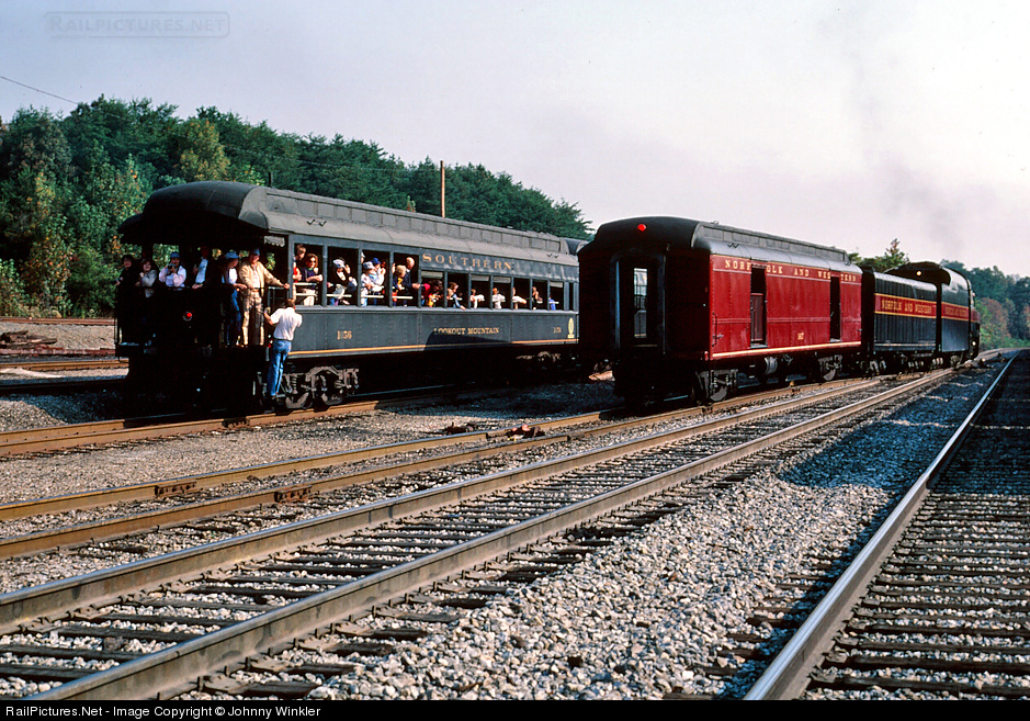 With a crowd of railfans and passengers in the "Lookout Mountain" open air car looking on, N&W makes a switchign move at Emory Gap, TN after an excursion trip. The "Lookout Mountain" car now resides on the San Luis & Rio Grande in Alamosa, CO.