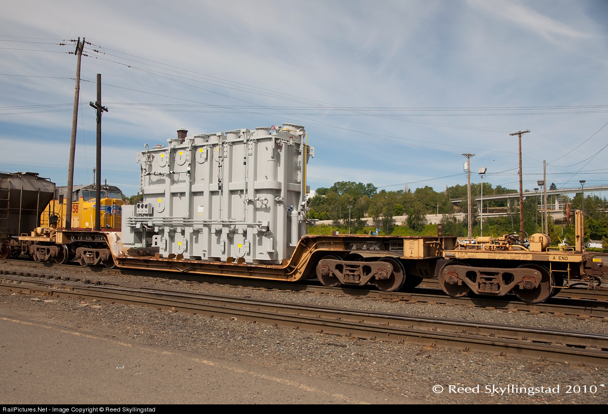 A large transformer heads south on a TTX 8-axle depressed center flatcar.