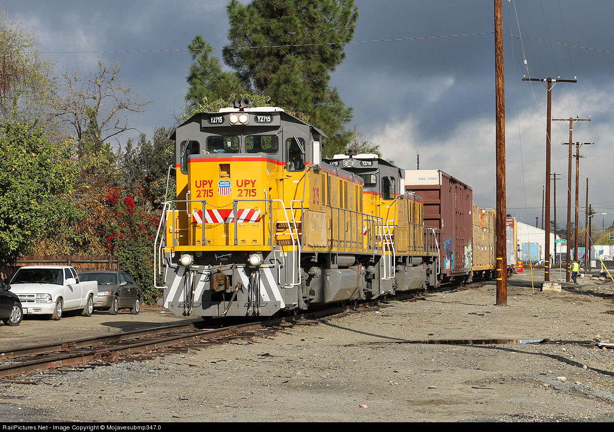 | After crossing the UP Los Angeles Sub, UPY 2715 leads the Ontario Local down the old Sunkist Lead as it heads for Grove Lumber for switching. |