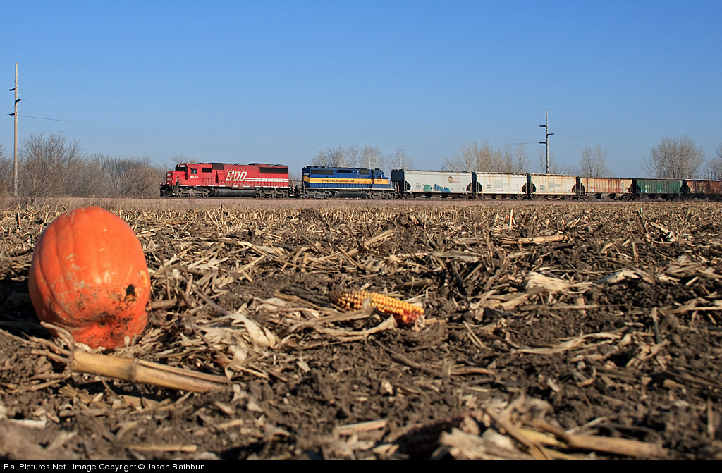 Train 633, ethanol empties with grain fillers on the front end, is seen passing a harvested field inside the city limits of Kasson, MN. The leftover ear of corn and pumpkin helped add an element to this fall scene. It looked to me like someone had used the pumpkin for target practice as it had a few bullet holes in it.