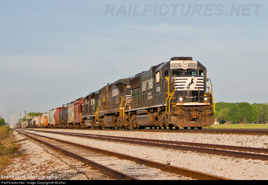 | NS 6606 Thunders through Sheffield,OH with NS 309 in tow on the Former NKP Bellevue - Buffalo Main, one of the least photographed NS lines in ohio. This was one of the best lashups ive seen on this line. |