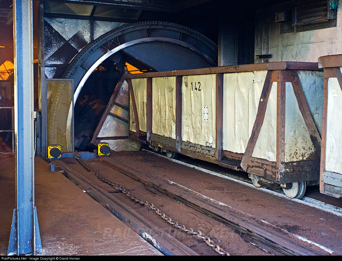 The West Offaly Power Station tippler functions by rotating through 360 degrees, dumping peat out of the loaded wagons into the receiving pit below. Dumping is well underway in this scene; while the tippler rotates, the wagon puller (running on the foreground track and connected to the massive chain) shuttles back to this end of its run to set up for pushing the train ahead another two car-lengths.