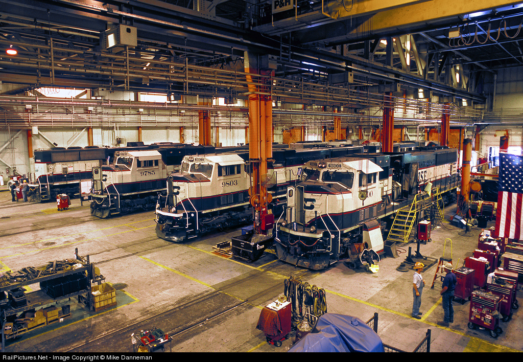 A group of Burlington Northern Santa Fe EMD SD70MACs share floor space in the diesel shop at Alliance, Nebraska, on July 21, 2003. Hauling heavy trains of coal takes its toll on these hard-working machines.