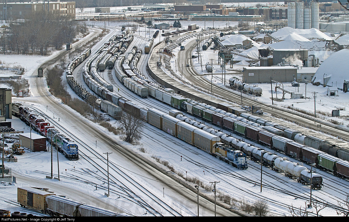 | A lazy winter afternoon at "The Belt" finds a crew working on the east end, and GMTX 2620 (ex-Penn Central GP38) ready to head out out onto the BNSF. Note the row of stored leased units and CP/Soo power in the adjacent CPR St. Paul Yard. |