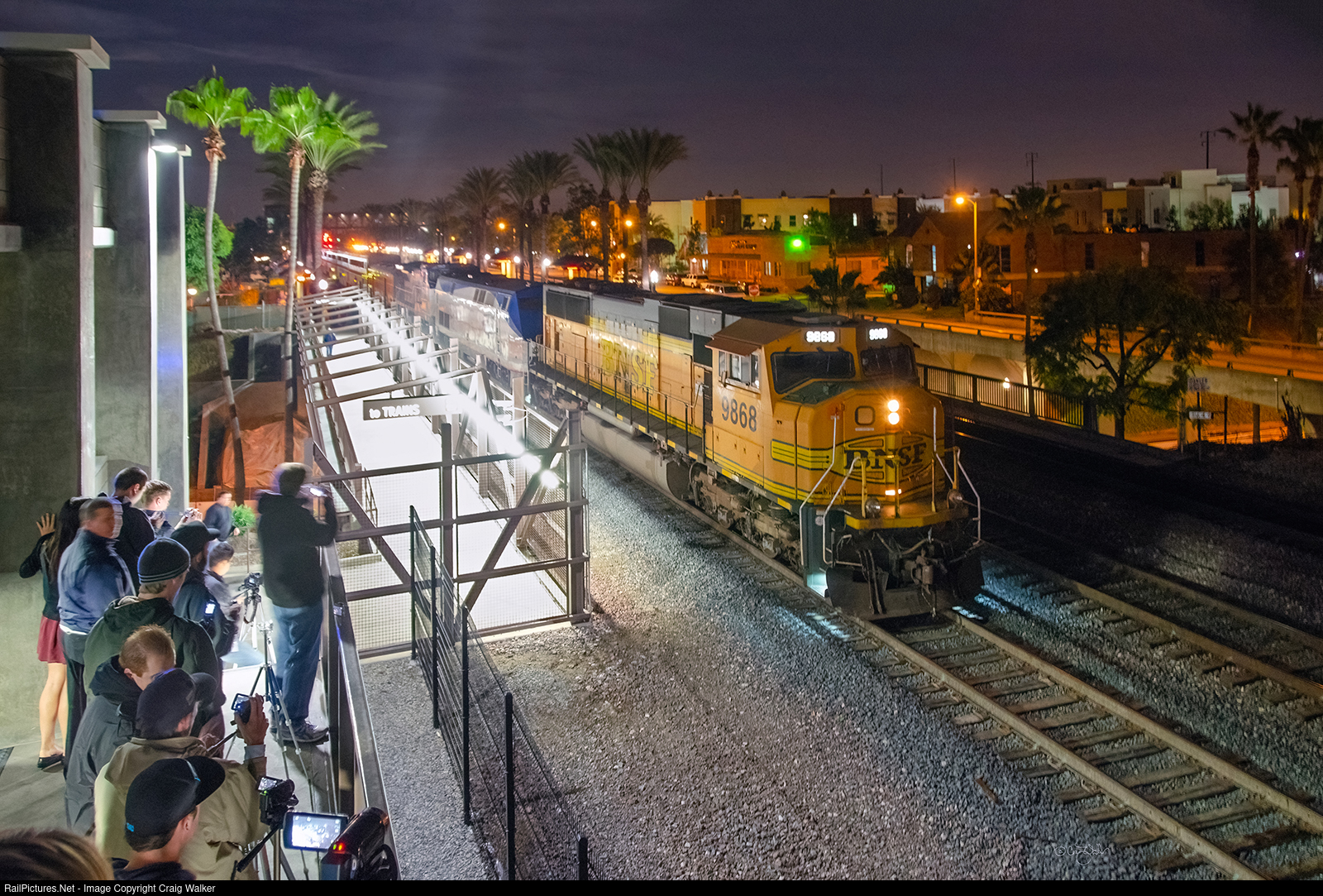 Amtrak train 3, the westbound Southwest Chief, has arrived in Fullerton just a little behind "the advertised" – due to depart Fullerton at 6:34 am, the train departed Fullerton at 7:23 pm! The train lost three hours due to engine problems between La Junta and Trinidad, Colorado, (resulting in BNSF loaning a freight engine, SD70MAC 9868, to assist Amtrak P42DC 113 and Dash 8-32BWH 500), then three and a half hours to run from Lamy, New Mexico, to Albuquerque. And as the old saying goes ("late trains just keep getting later"), this train lost more time due to a four-hour stop at Albuquerque! Thanks to the internet, word was out about the SD70MAC, a rare bird in California, and rarer still in passenger service, and the station platform was swarming with railfans! (Fullerton, California – December 28, 2012)